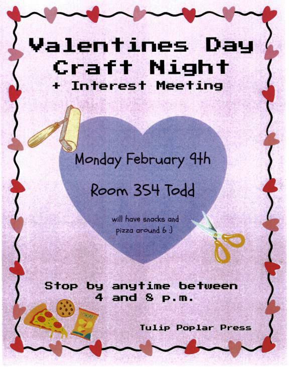 Create cards, crafts, and Valentine surprises in this evening event hosted by AIGA students.
