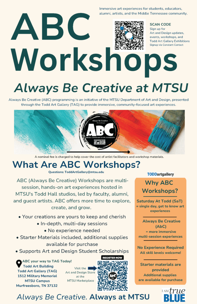 This lecture series, presented by Middle Tennessee State University’s Department of Art & Design, highlights specific voices from diverse backgrounds, cultures, and life experiences. MTSU instructors handpick all guest lecturers, and although topics vary, content is always art-related.